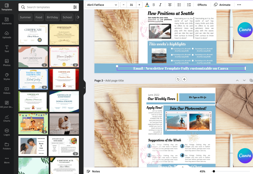 Use the search field on top of the black left panel to search elements such arrows, frames, boxes, layouts and many more to add to your design. Once you are done customizing go at the right upper corner to use the “Share” button. You will see available options to download your design. Canva has an auto saving system so you don’t need to save online.