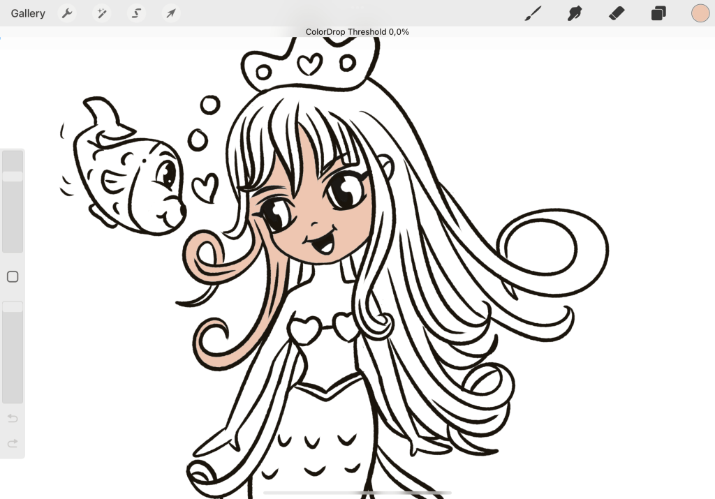 Select the beige color and from the top right panel (where you see the circle with the color) just drag it with your pencil over the area you wish to color. Here I have dragged it over the face. You may need to adjust the coloring by keeping your pencil down and moving the slider left and right until you get a good balance. This happens when all lines are completely close. But it’s also part of any coloring process so just bring it the slider as closer as you can to the desired result and you can erase the rest using the eraser.