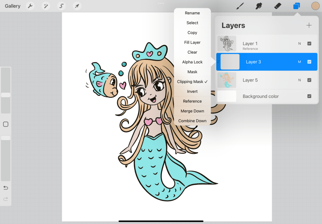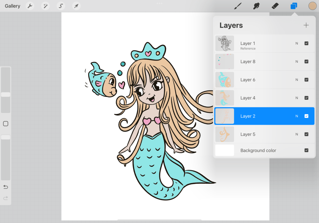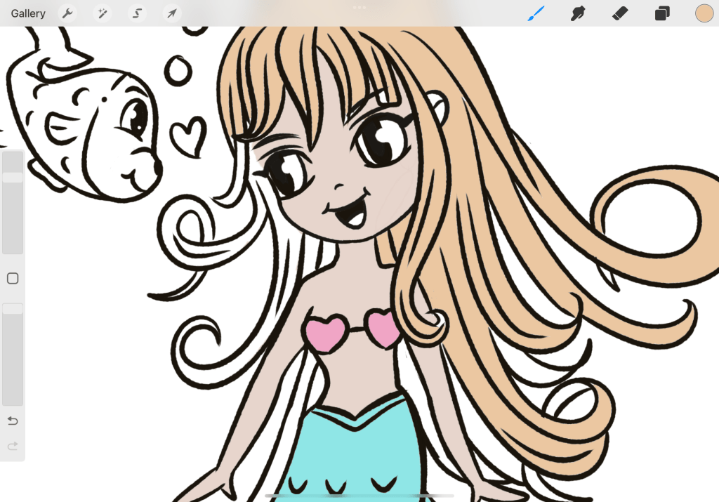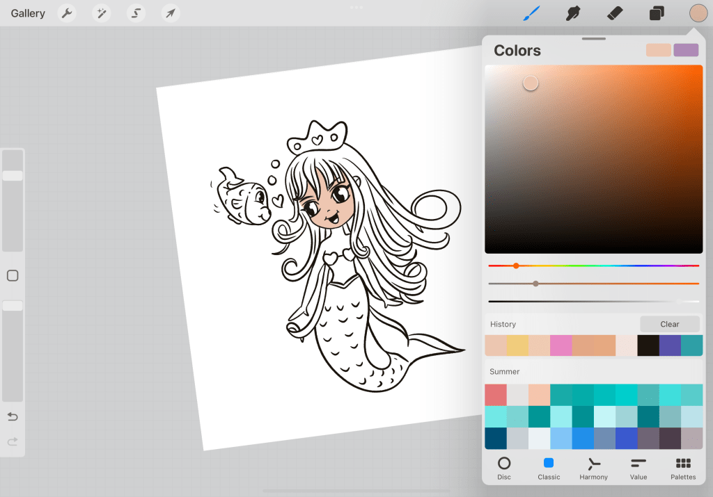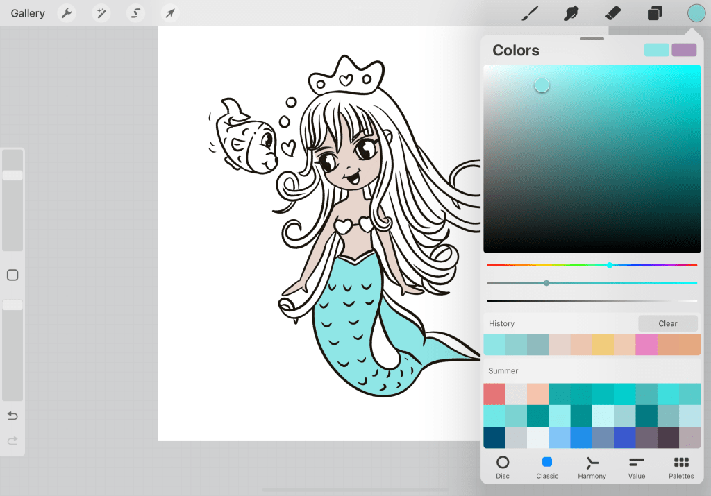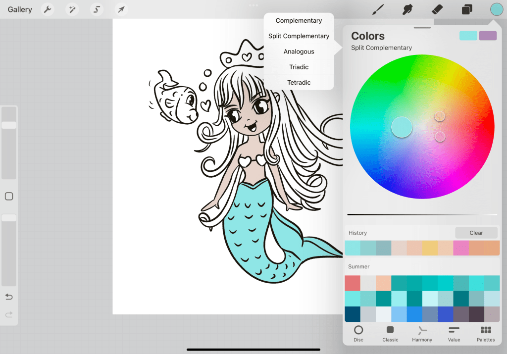 Once you are done (make sure that your reference and your colored body are 2 different layers)…use a color for the tale. In particular, I have chosen the light blue on the left (the one that has the coral on top and the deep blue beneath.) Now let’s find colors that really match the colors we have used so far. Tapping on the circle of the color you have chosen go to Harmony. There you can choose among complementary colors, split complementary, analogous, triadic, and tetradic. Don’t be intimated by the names. All these are just different color type combinations that work well with a selected color. This is not the time to go deeper into these> but here I have chosen Split commentary so I can work with 3 colors and also create a contrast. So it gives me a saturated yellow and pink color.