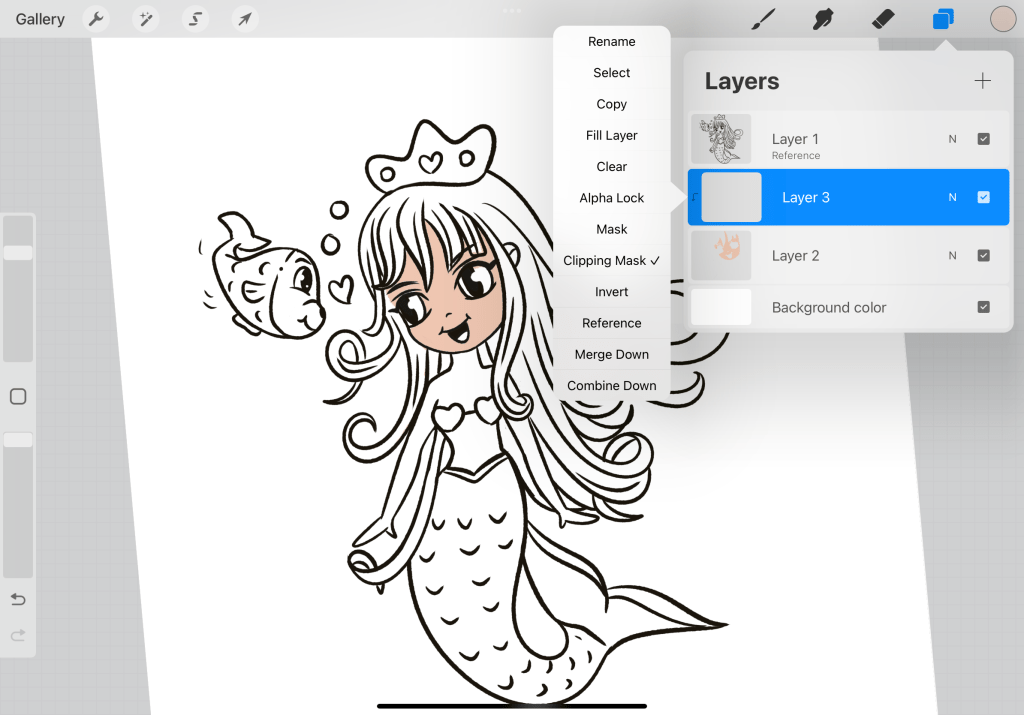 Once you are done with applying basic color, create a new layer…Here I have merged all the previous color layers in one by merge. But if you want you can keep them by duplicating each layer grouping them and deactivating them, so you can see the merged layer. The new layer on top is going to be used in order to create shadows. So you will need to assign it as a clipping mask.