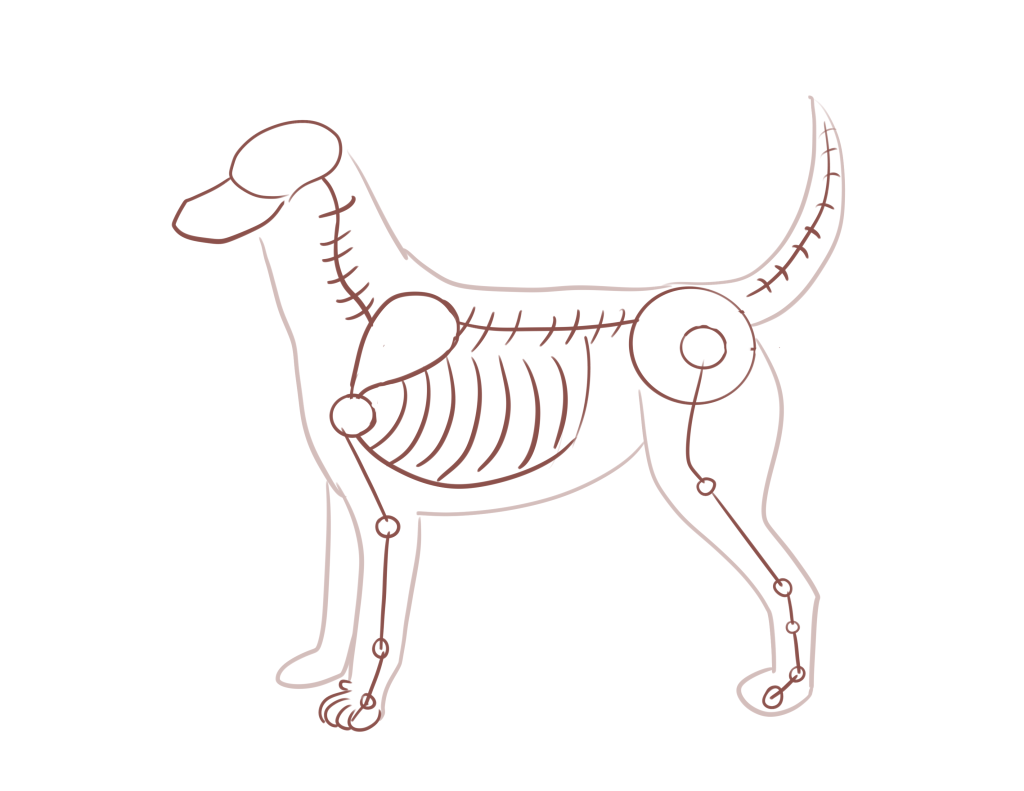 The pelvis connects to the back legs. In the above image, I drew, you can see the pelvis in a simple artistic sketch defined with a circle and connecting to the back foot. Other remarks show that the spine connects to the tail and the rib cages are a major part that defines the front.